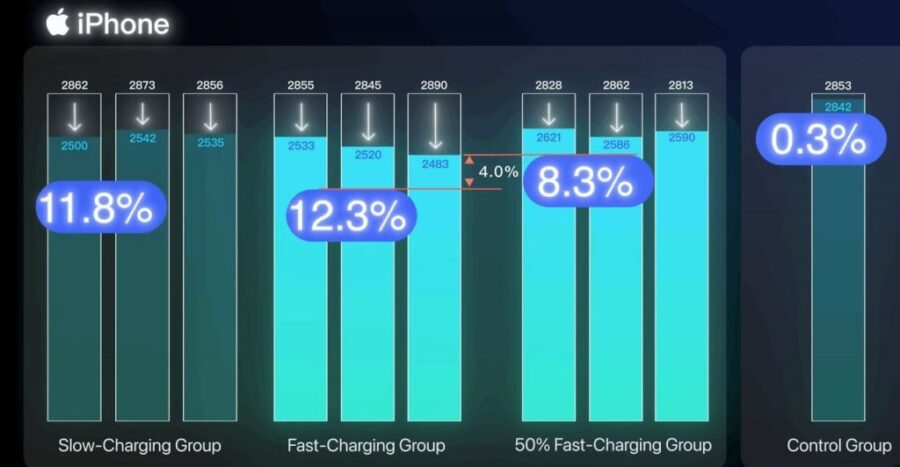 تیم این کانال شش ماه زمان را صرف انجام یک آزمایش کنترل‌شده روی 20 گوشی هوشمند کرده است. آنها 10 دستگاه آیفون 12 با سیستم‌عامل iOS و 10 گوشی Vivo iQOO 7 با سیستم‌عامل اندروید را انتخاب کردند. سپس هر گروه به دسته‌های مختلفی تقسیم شد؛ گوشی‌های یک گروه با Fast Charge شارژ شدند، برخی دیگر با شارژرهای معمولی و گروه سوم فقط بین ۳۰ درصد تا ۸۰ درصد شارژ شدند. آخرین گوشی از هر دسته نیز اصلاً شارژ نشد تا نقش گروه کنترل را بازی کند.