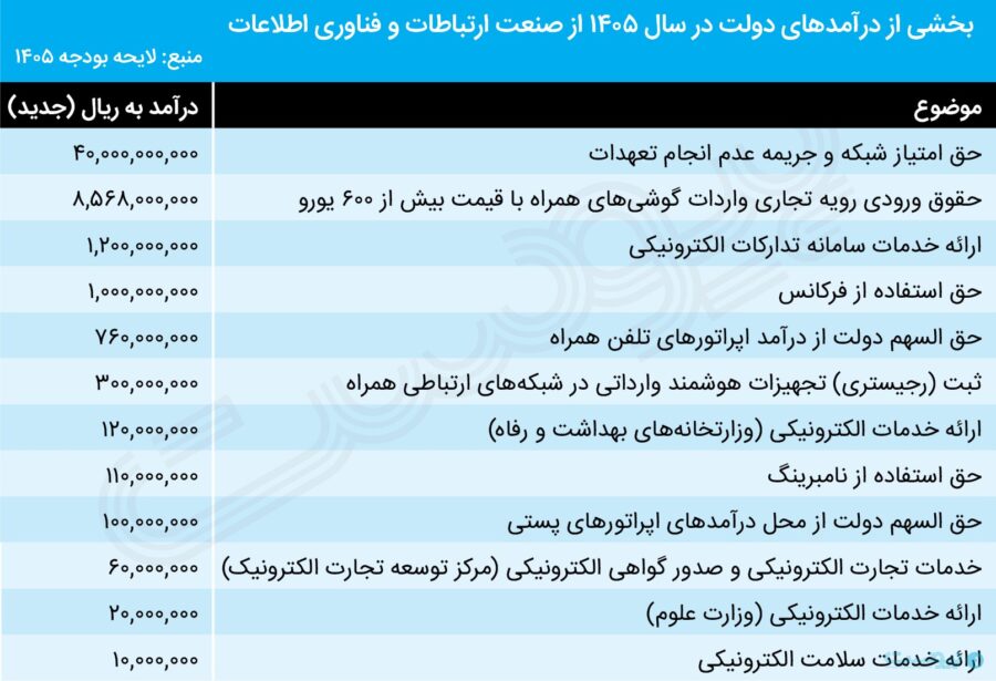 آنچه ذکر شد، ردیف‌های اصلی درآمد دولت از موضوعات مرتبط با ICT است ولی ردیف‌های متعدد دیگری مانند صدور کارت هوشمد ملی، ارائه خدمات فضایی و… نیز در لایحه بودجه وجود دارد.