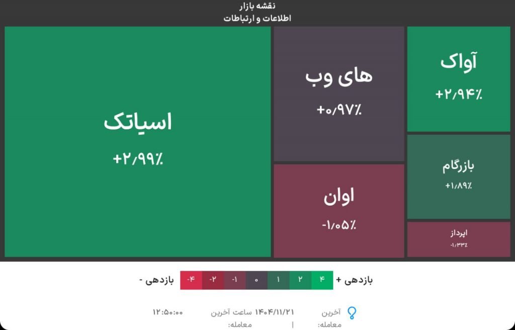در گروه اطلاعات و ارتباطات نمادهای مثل اسیاتک، آواک و بازرگام، مثبت معامله شدند.
