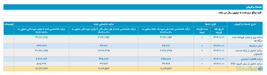 طبق صورت‌مالی منتشر شده روی سامانه کدال از سمت سپ، درآمد این شرکت از بخش ارائه خدمات کارتخوان در دی‌ماه ۲۶۷ میلیارد و ۸۳۲ میلیون تومان قید شده است. درآمد این بخش در ماه گذشته حدود ۲۸۱ میلیارد تومان بود.