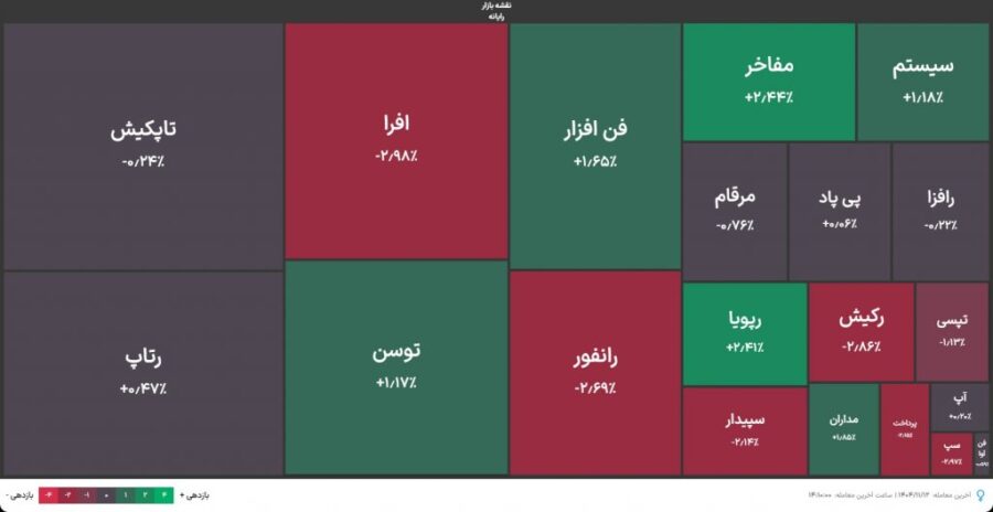 گفتنی است که در جریان معاملات امروز، ۳۶۶ نماد در محدوده مثبت و ۳۵۴ نماد در محدوده منفی معامله شدند، یعنی امروز حدود نیمی از نمادهای بازار سبزپوش و مثبت بودند.