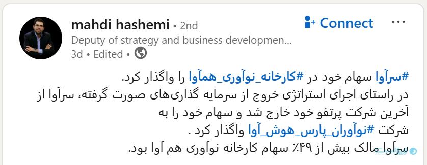 مهدی هاشمی این اقدام را در راستای استراتژی خروج از سرمایه‌گذاری‌های صورت گرفته توسط سرآوا نامید و با انتقال سهم ۴۹ درصدی به هوش‌آوا، این شرکت از آخرین گزینه سبد سهام سرمایه‌گذاری خود نیز خارج شد. امانکته قابل توجه واگذاری سهام «سرآوا پارس» به شرکت «نوآوران پارس هوش آوا» است که به نظر می‌رسد میراث‌دار خلف سرآوا خواهد بود.