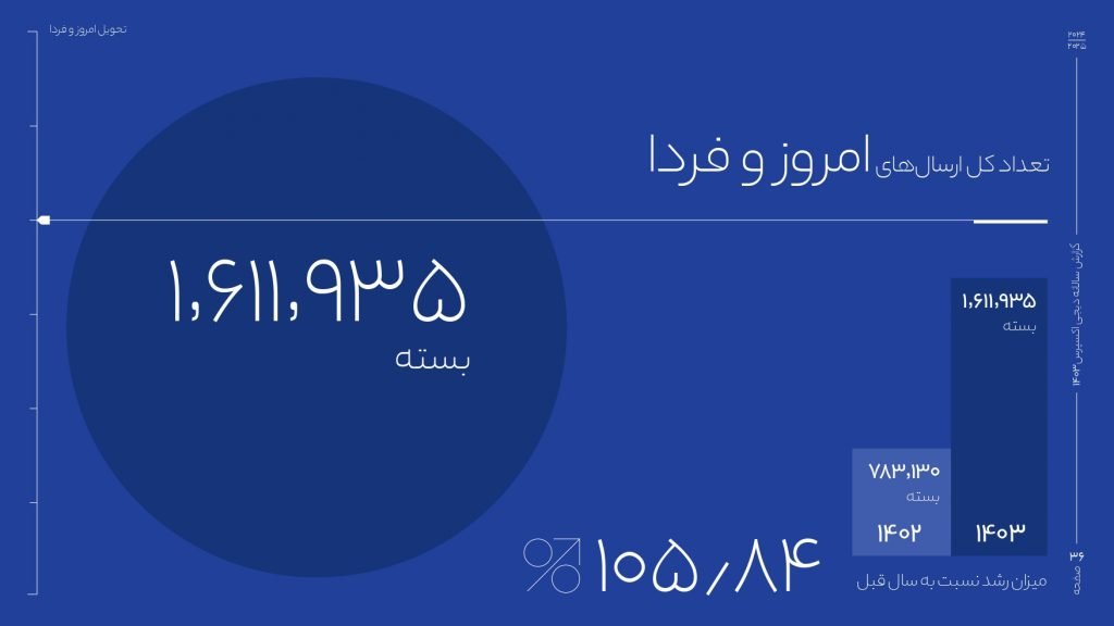 تنها سرویس «تحویل امروز و فردا» در سال ۱۴۰۳ بیش از یک میلیون و ۶۰۰ هزار مرسوله را پوشش داد که نسبت به سال قبل بیش از ۱۰۵ درصد رشد را نشان می‌دهد. همچنین، بیش از ۳۰ میلیون بسته از طریق سرویس تحویل زمان‌بندی‌شده به مقصد رسید؛ رشدی ۱۱ درصدی نسبت به سال گذشته.